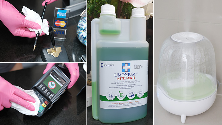 - สิ่งของติดตัวมาเช่น โทรศัพท์ เสื้อคลุม กระเป๋าถือ เอาเข้าตู้อบฆ่าเชื้อ UV-C ขนาดใหญ่ที่ร้านจัดเตรียมไว้ให้