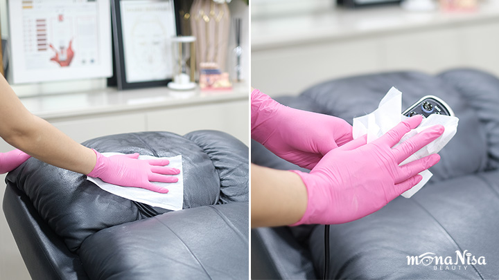 การทำความสะอาดฆ่าเชื้อเก้าอี้,เตียงสัก, station วางอุปกรณ์ขณะทำงาน