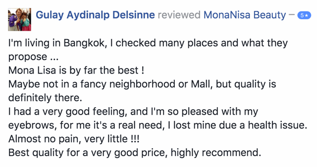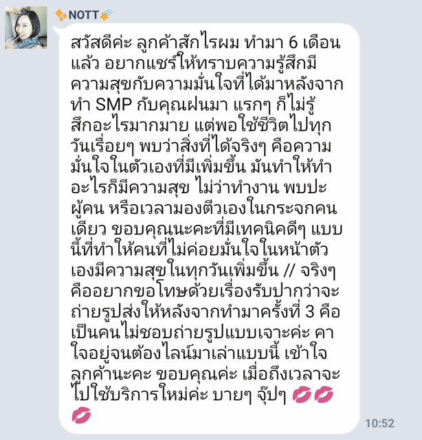 คอมเม้นท์จากใจ อยากจะบอกว่า ได้ไปสักปากที่ร้านร้านหนึ่งในห้างเซ็นทรัลฯ มา ซึ่งเป็นร้านที่ดูดีมาก ราคาค่อนข้างแพงกว่าคุณฝนเท่าตัวและได้เกิดการเปรียบเทียบถึงคุณภาพในทุกด้าน ไม่ว่าจะเป็นผลิตภัณฑ์ที่ใช้ การบริการ หรือผลลัพธ์ที่ได้ มันช่างแตกต่างกันมากเหลือเกิน คุณฝนใส่ใจลูกค้าทั้งก่อนทำ ตอนทำ และหลังทำเสร็จมากๆ ผลิตภันฑ์รวมถึงเครื่องมือทุกชิ้นเป็นของมีคุณภาพและสะอาดปลอดภัยมากๆ และคุณฝนก็มีเทคนิคการทำที่สามารถทำให้คุณได้ผลลัพธ์ที่ดีจริง เพราะเขามีพรสวรรค์ด้านนี้จริงๆ เรารู้ได้เลยว่าเวลาทำกับคุณฝน เธอไม่ได้ทำเพราะมันเป็นหน้าที่ แต่เธอทำด้วยใจพราะใจรัก ดังนั้นผลลัพธ์ที่ได้ก็ไม่เคยทำให้มีคำว่าผิดหวัง เราไม่ได้สักแค่ปากกับคุณฝนนะ ส่วนอื่นเราก็ทำ และก็ประทับใจกับผลลัพธ์ที่ได้ คนที่ทำมาใหม่ๆ ถ้าสียังไม่ถูกใจเท่าไหร่ ขอให้รอนิดนึง บางทีครั้งแรกอาจจะดูเหมือนออกมาโอเคแต่ยังไม่ถูกใจมาก แต่พอถึงเวลาว่าสีมันคือสีนี้แน่นอนแล้วจะถูกใจมาก ถ้าเป็นปากอาจจะสองสามเดือน แบบว่าสีที่ได้มาที่ว่าเดือนแรกถูกใจ โอเคอยู่นะ แต่พอสองสามเดือน สี่ห้าเดือนต่อมา ถูกใจมากกว่านั้นอีก มีคนทักว่าทาลิปของอะไรเราบอกไม่ได้ทาสักสีปากมา เขาก็บอกว่าเขาสักเหมือนกันที่อื่นแต่ทำไมสีไม่สวยเหมือนของโมนาเขาเสียใจมาก ใครสนใจก็ลองใช้บริการเธอดูนะ อย่างน้อยที่สุด คุณไม่เสียน้ำตาเพราะความผิดหวังหลังการทำแน่นอน
