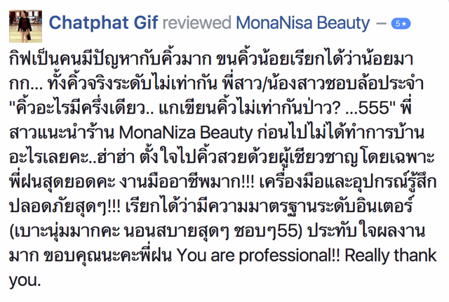 แต่ก่อนเวลาจะออกบ้านไปไหนจะเสียเวลามากกับการแต่งหน้าเพราะคิ้วไม่มี ไม่มีเลยจริงๆๆต้องใช้ดินสอเขียนคิ้วนั่งเขียนวาดคิ้วให้ได้รูปสวยเสียเวลาเป็นชั่วโมง พอล้างหน้า ว้าย!!นึกว่าแม่ชี แต่ตอนนี้มีคิ้วแล้ว สวยแล้ว 55 ตั้งแต่ไปทำคิ้วสามมิติแบบผสมลายเส้นกับน้ำฝนที่ MonaNisa Beauty ตอนนี้คิ้วได้รูปสวย เป็นธรรมชาติมาก จะแต่งหน้าหรือหน้าสด ก็มีคิ้วแล้วค่ะ มั่นใจขึ้นมาก ต้องขอบคุณน้ำฝนมากๆๆเลยนะจ๊ะ ขอบคุณ MonaNisa Beauty ค่ะ